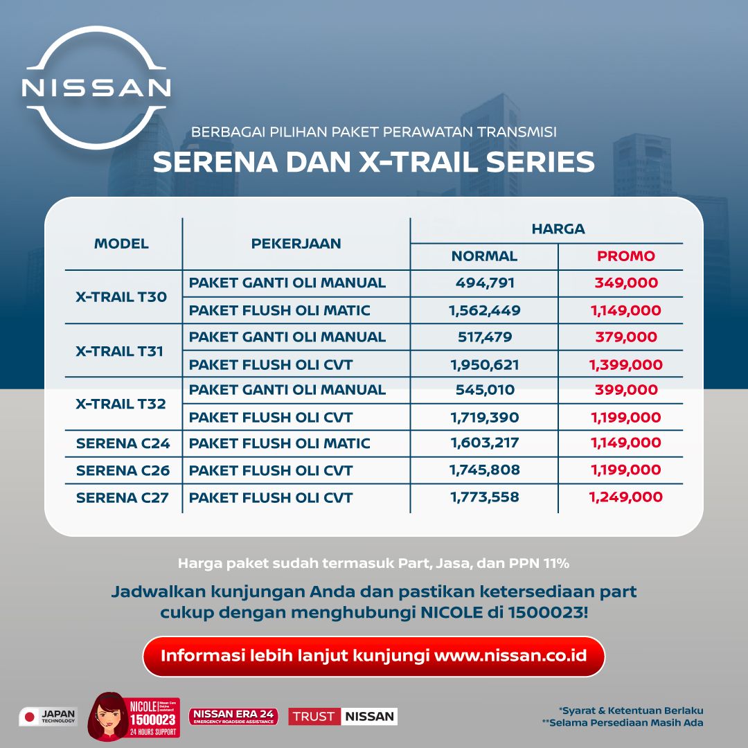 Penggantian atau flush oli transmisi pada kendaraan merupakan salah satu item perawatan penting kendaraan. Penggantian atau flush oli transmisi dapat dilakukan mulai dari 60.000 KM sekali. Nissan Indonesia menghadirkan paket promo perawatan transmisi untuk Nissan Serena dan X-Trail melalui program Serena & X-Trail Transmission Week. Program ini diadakan pada 15 – 29 Februari 2024 di seluruh dealer resmi Nissan di Indonesia.