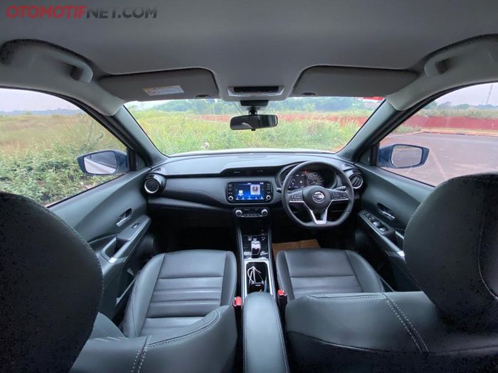Sebelum kita bahas interior, secara tampilan New Kicks e-Power ini masih tampak sama dengan generasi sebelumnya. Hanya saja ada penambahan aksen reflector warna merah, yang menyambungkan kedua lampu belakangnya yang sudah LED. Selebihnya sama. Nah, ubahan terdapat pada saat kami masuk ke dalam kabinnya yang sudah keyless entry. Memang secara desain maupun pewarnaan, interior Kicks e-Power terbaru ini juga terlihat sama dengan varian sebelumnya, dimana didominasi warna hitam dan joknya sudah dibalut kulit.
